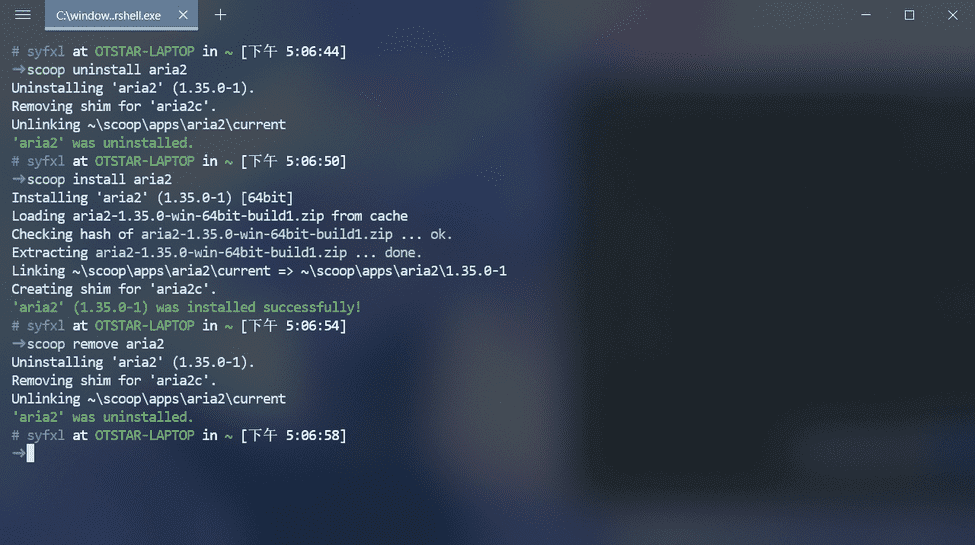 ,注意:Scoop 偶尔 可能会因为网络错误安装失败,但是 Scoop 会显示已安装,这时可以用 scoop uninstall <app>