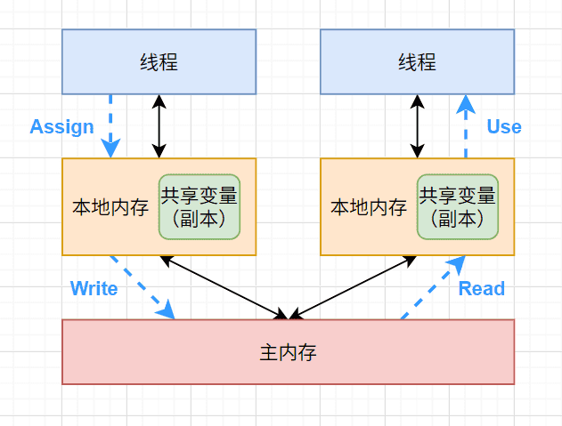 过程图中已经画好了,当第一个线程更改某个共享变量的时候,会先更新本地内存,然后写入到主内存,第二个线程从主内存中读取更改过的变量然后使用。