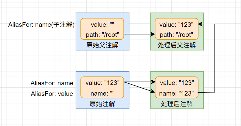 变成 Java 的注解呢?如果直接返回通过反射获取的注解,那么别名和子注解的值传上来的值就无法被更改,所以为了获得 Java 的注解,Spring 会重新创建该注解的注解代理类。